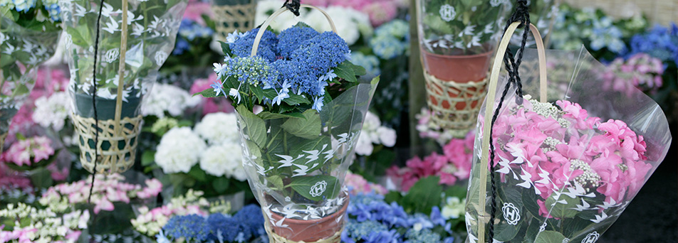 “수국”판매1화분 : ¥ 1500 ~인기 수국, 보라색·핑크·화이트 등 수국 전시회일본 각지에서100 종의희귀 수국의꽃을 모았다. |